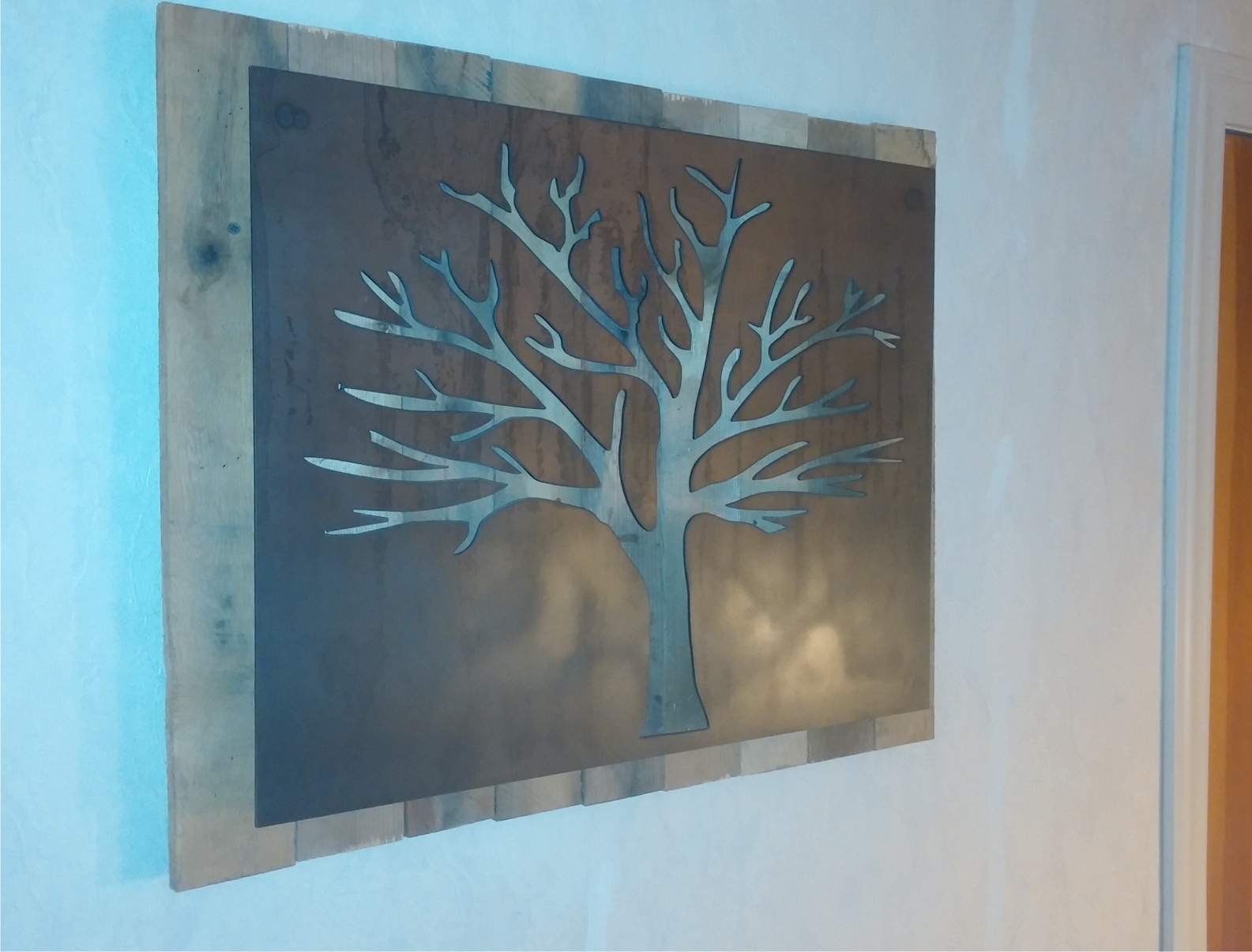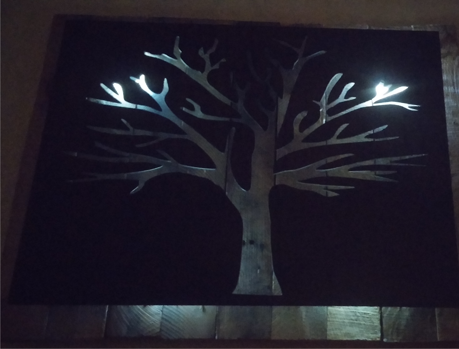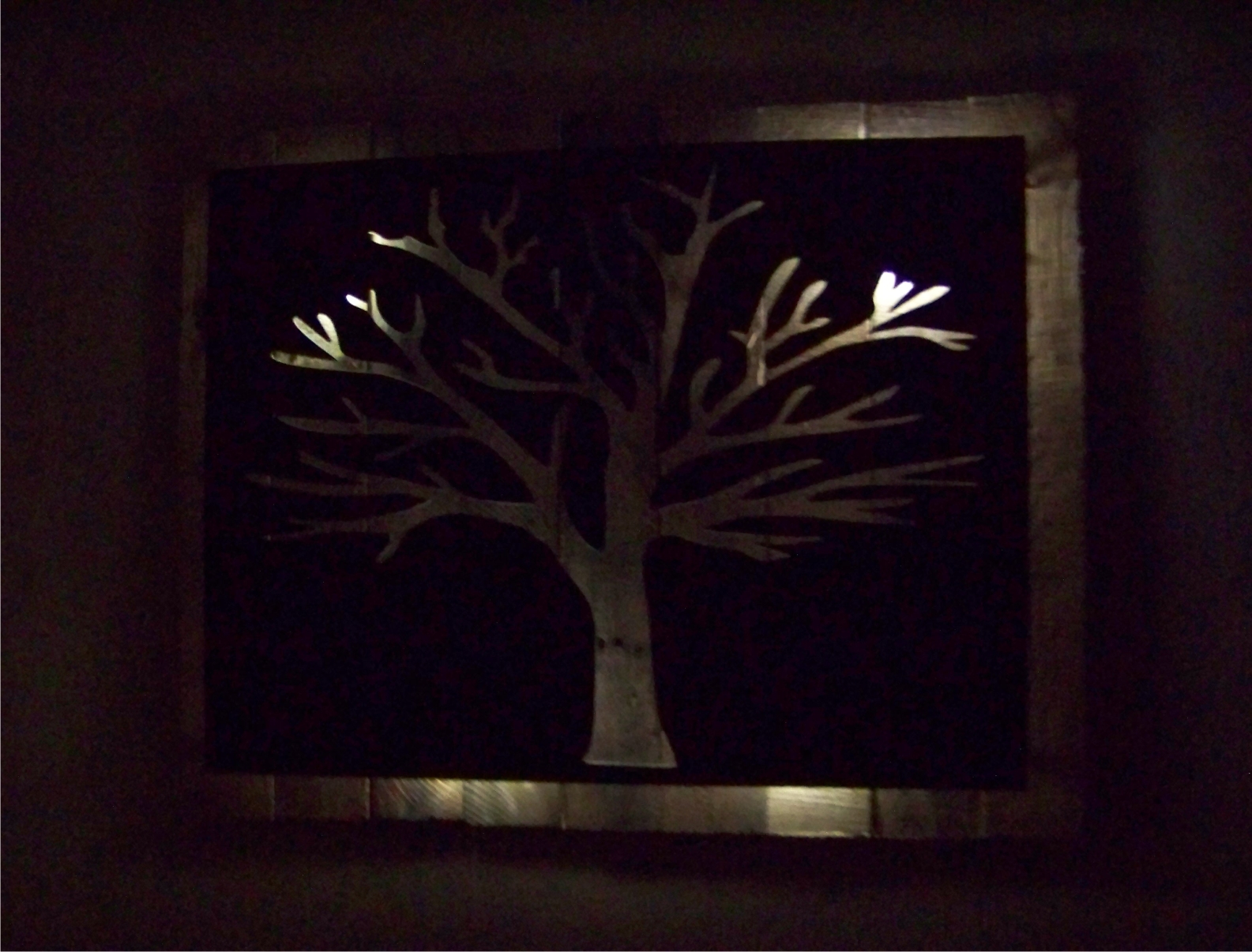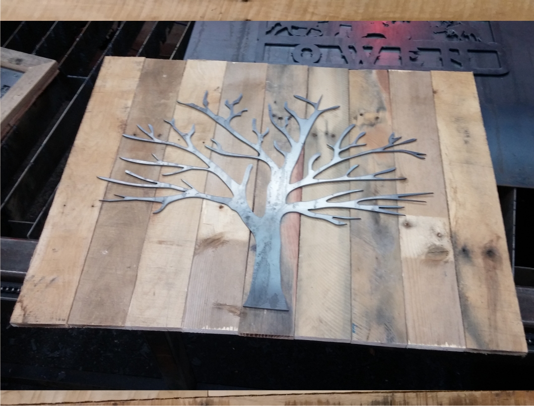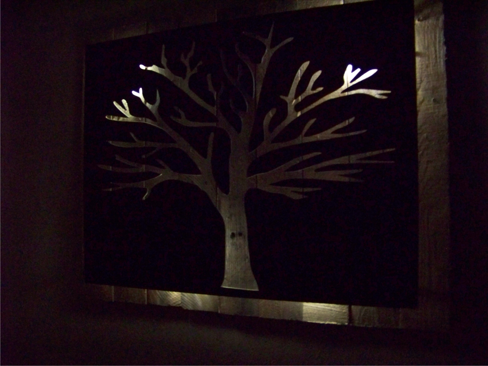 Metal Tree Art | Stand off metal cut out tree with reclaimed wood backdrop finished with back lighting.