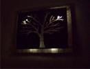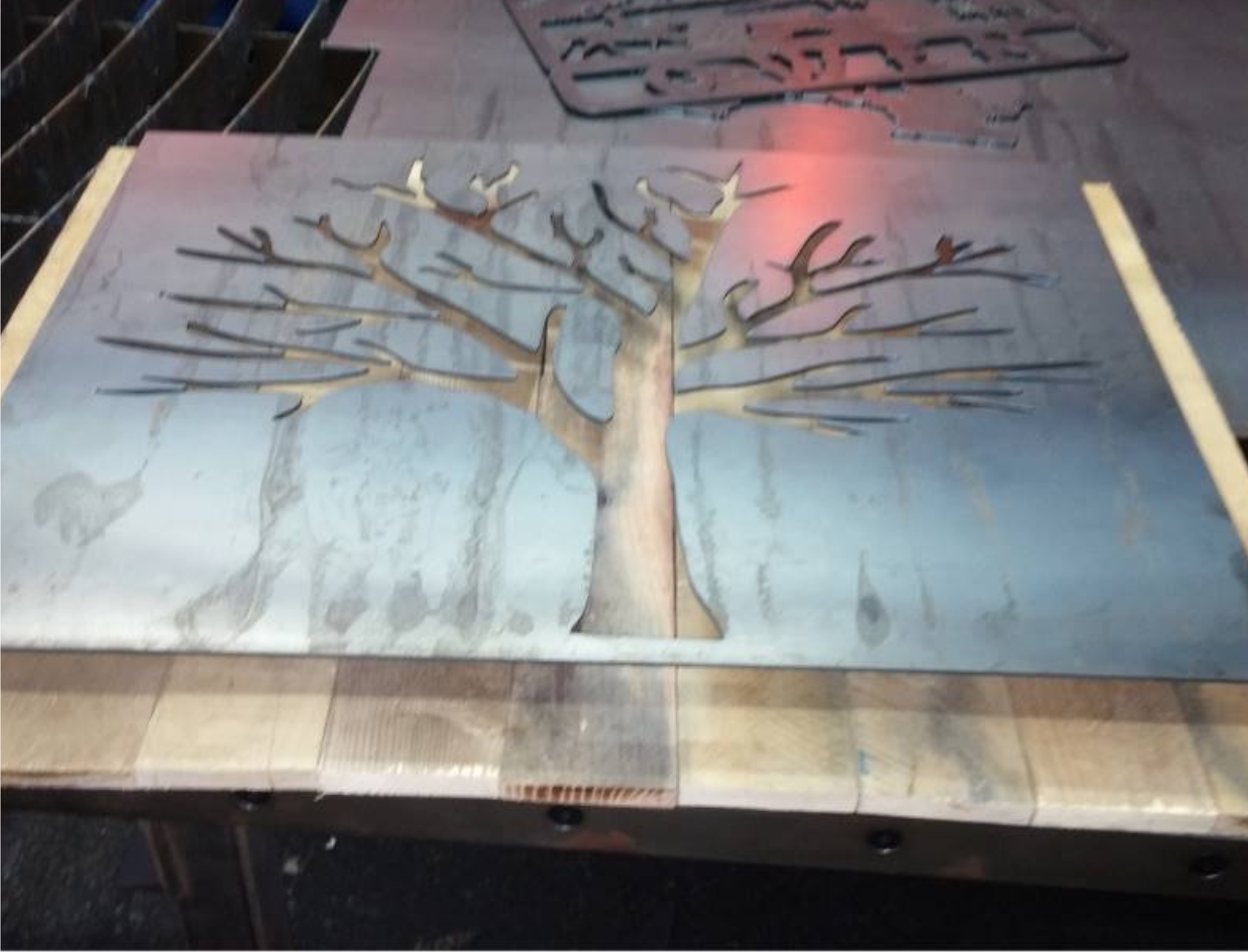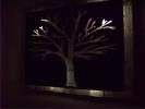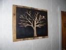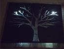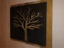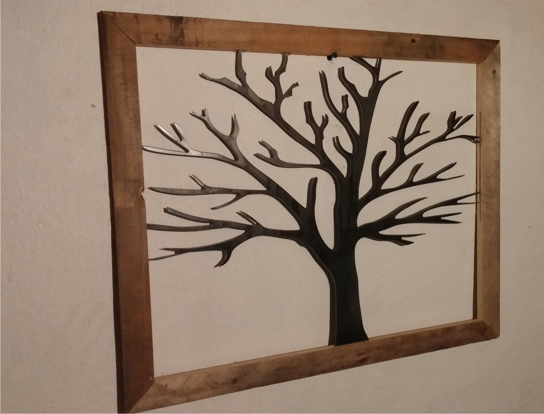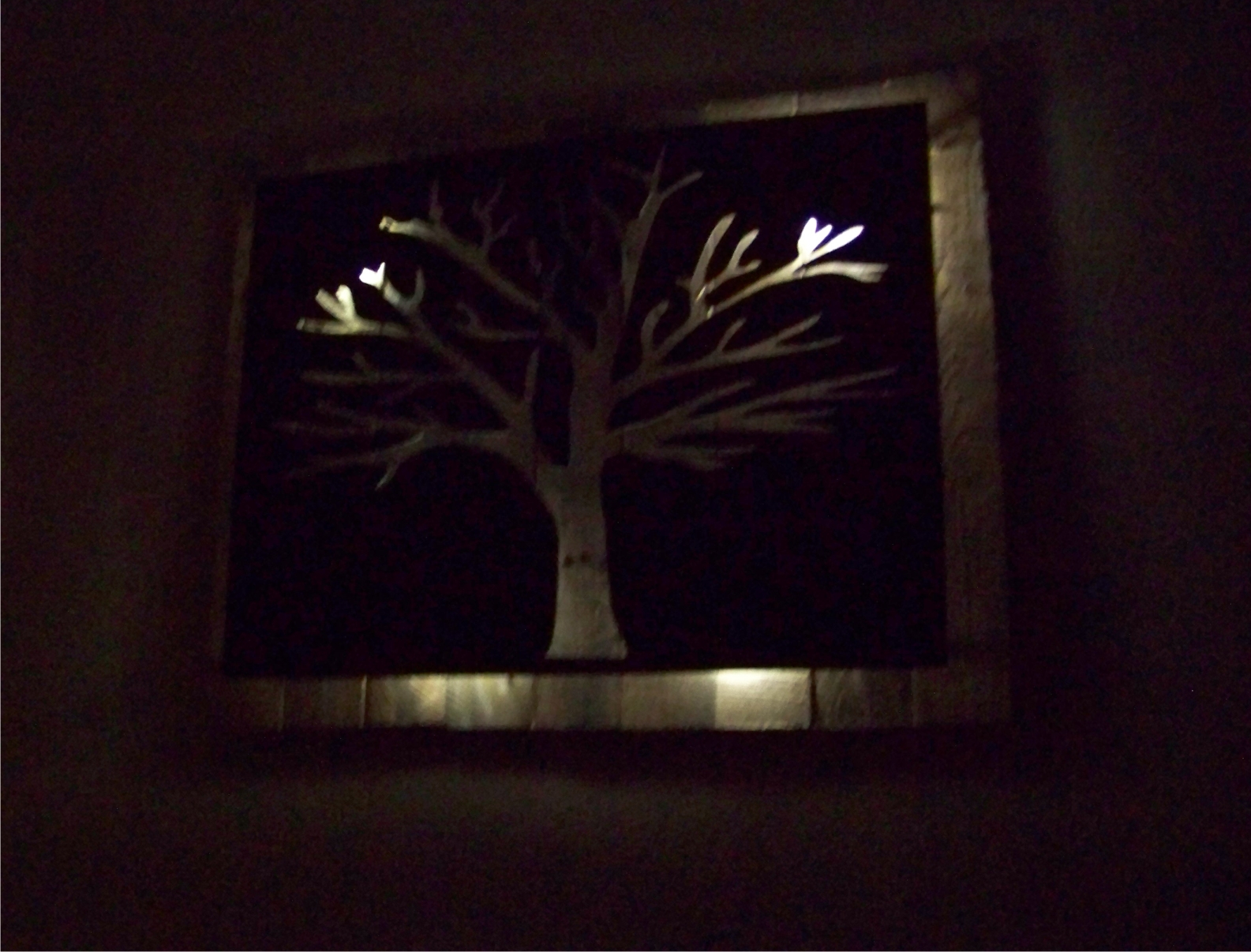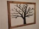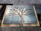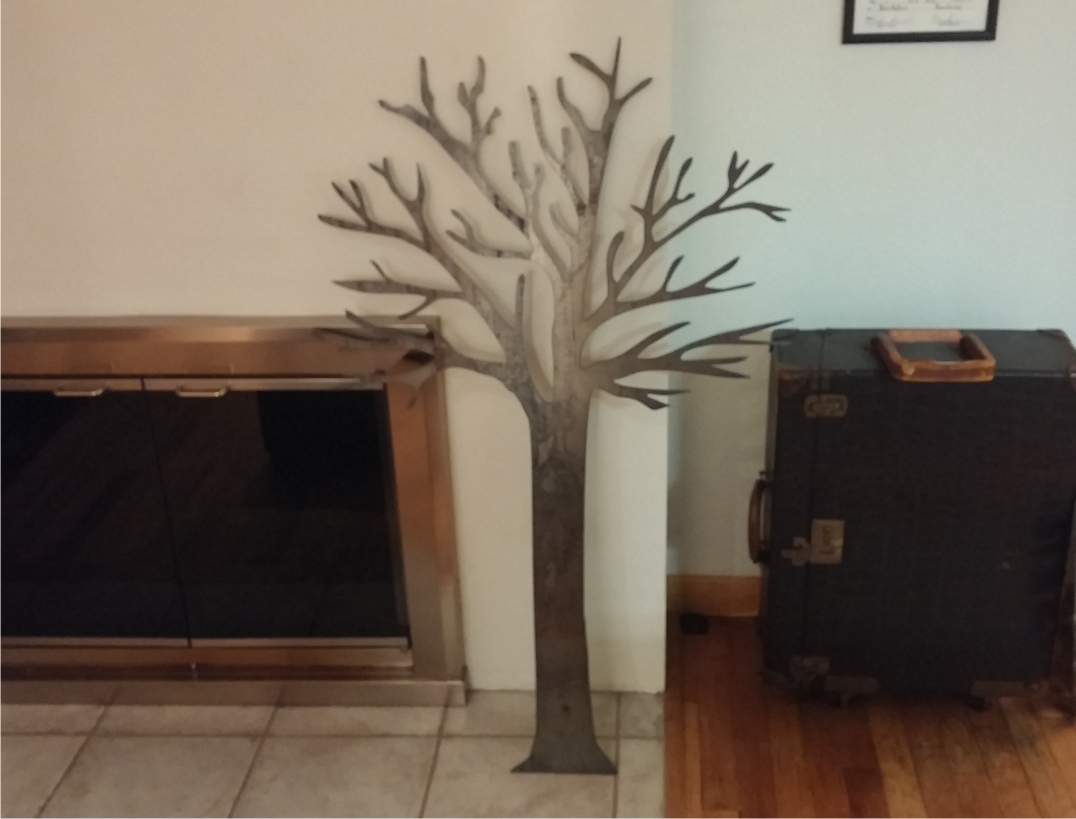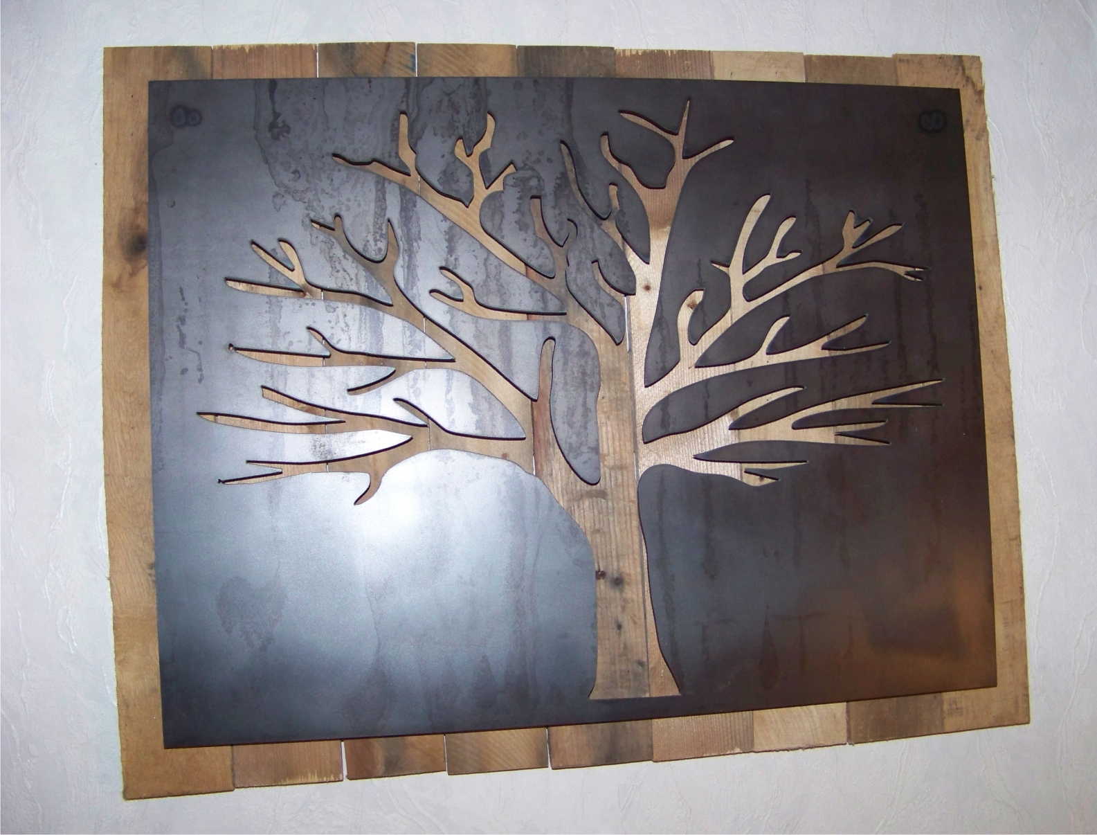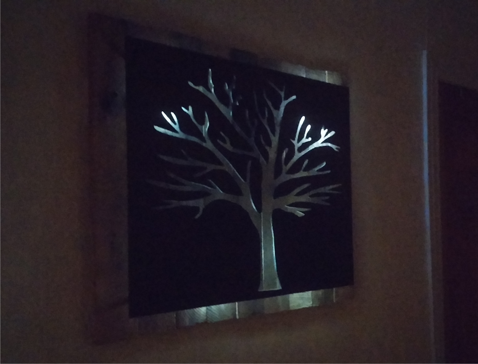 Metal Tree Art | Stand off metal cut out tree with reclaimed wood backdrop finished with back lighting.